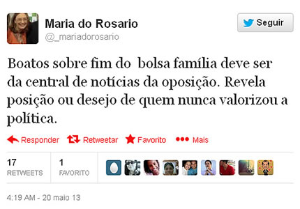 A ministra Maria do Rosário (Direitos Humanos) afirmou na manhã de hoje, em sua conta no Twitter, que "boatos sobre fim do Bolsa Família devem ser da central de notícias da oposição". "[O boato] revela posição ou desejo de quem nunca valorizou a política."